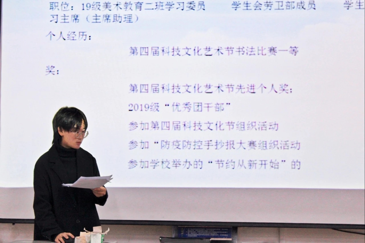 为了使学院团学组织更加完善,为广大同学提供一个展示才华、锻炼自我的平台。近期,艺术教育学院开展了团学组织纳新竞选工作与2020届主席团、主席助理团、部长、副部长换届工作。