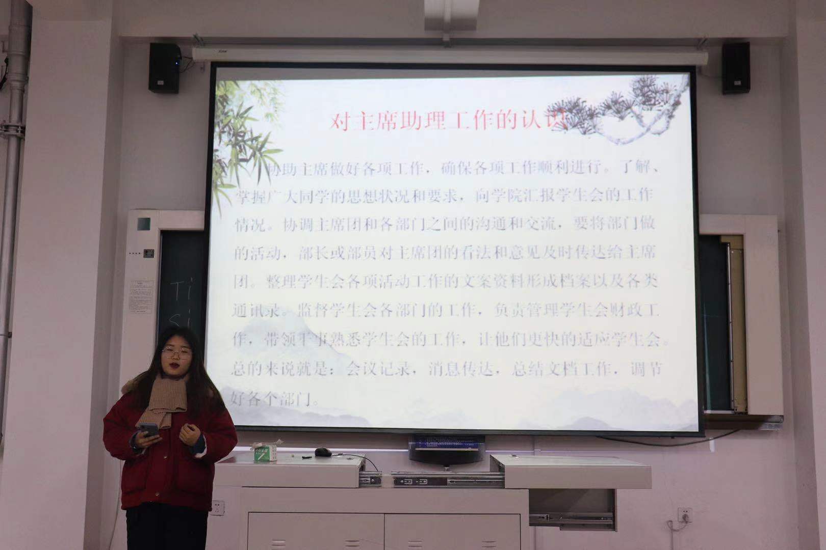 换届活动前,同学们根据自身实际情况,对主席团、主席助理团、部长、副部长进行换届竞选报名。换届过程中每位竞选同学进行时长为3-5分钟竞选演讲并现场展示竞选ppt。为秉承公平、公开、公正原则,主席团、主席助理最终结果由学生会成员现场投票与教师投票结果综合产生。部长、副部长竞选由本部人员自行组织,参加竞选的同学要进行竞选演讲,最终结果由部门全体人员进行现场投票选出。