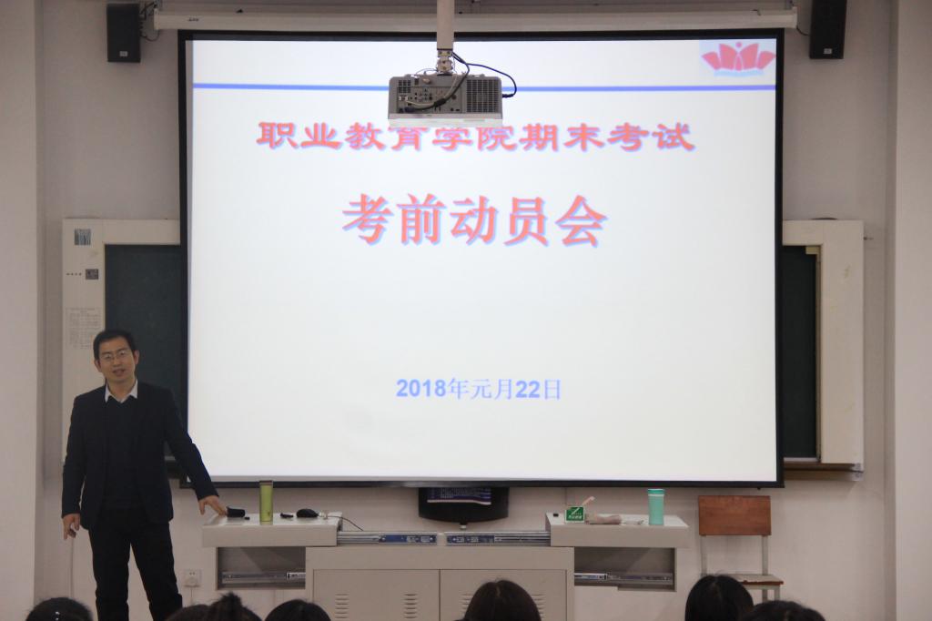 本学期的学习生活已经接近尾声,为了使17级学生更为深入地了解大学考试,在进入大学的第一次期末考试中能取得优异成绩,职业教育学院党总支书记、院长邱兆学于2018年1月22日下午2时1O分在阶梯十教室举办期末考前动员大会,同时还开展了诚信考试和安全教育等系列宣讲活动。