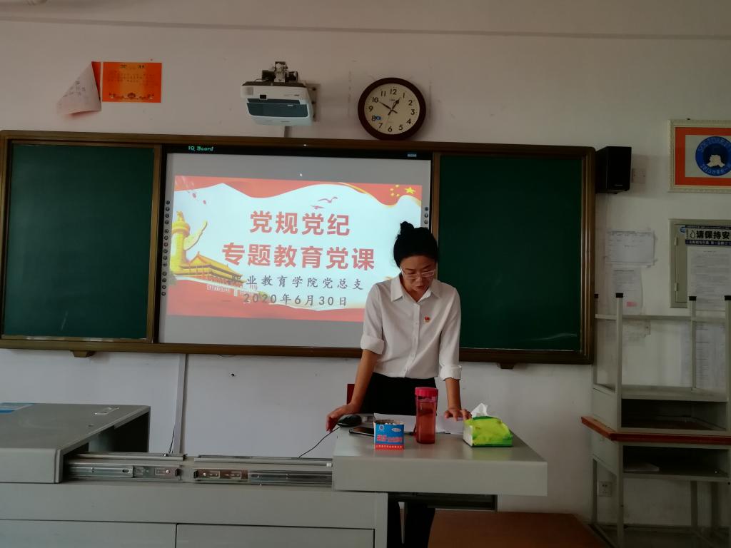 按照市委组织部有关工作要求,根据开展“我来讲党课”活动的需要,6月30日,职业教育学院在213召开了《党规党纪》主题党课,学院党总支副书记侯艳红、副院长张成强及全体党员参加了党课学习。侯艳红副书记主持了党课学习。