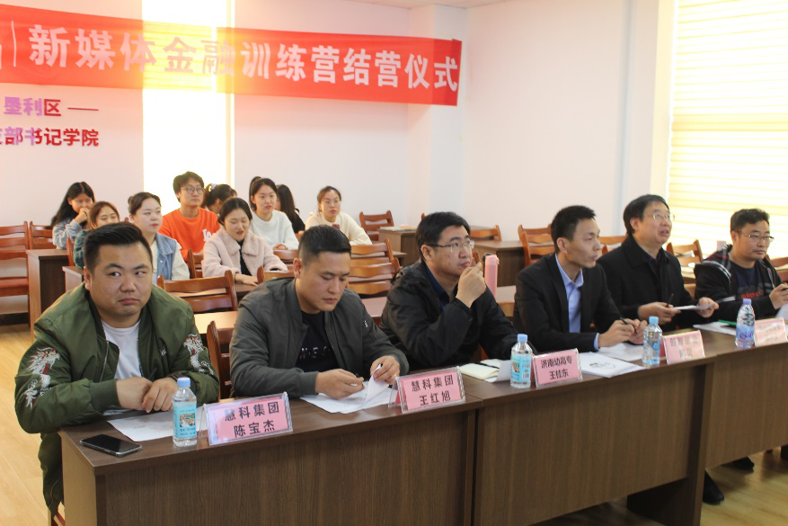 2020年10月30日上午10点,职业教育学院2018级互联网金融专业新媒体金融训练营结营仪式在东营创智维度实训基地拉开了帷幕。互联网金融专业负责人吴兴文、数字媒体应用技术专业负责人宋济明、市场营销专业负责人王桂东、东营创智维度实训基地总经理陈荧、慧科集团环海区招生顾问王红旭、慧科集团环海区高级运营陈宝杰参加了本次结营仪式,听取了训练营成果汇报并对学生作品展示进行了点评打分。参加训练营的同学们经过了两个多月紧张的培训,分4组对成果进行了汇报,经过紧张、激烈的角逐,三个互联网金融推广项目“鲁字号”、“农家乐”、“向钱进”分别获得第一、二、三名。