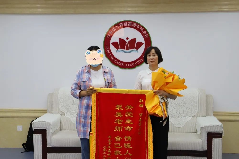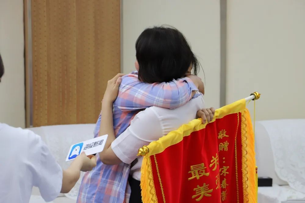 姜女士将一面写着“关爱生命 情暖人间 最美教师 舍己救人”的锦旗郑重地送到宋老师的手中。她很庆幸在自己生命危险的紧急关头遇到宋老师,她激动地说:“我以后每年都来看您,您就是我最信任的人。”