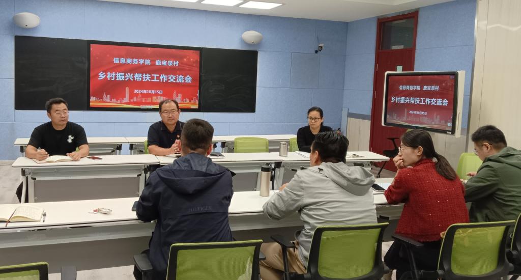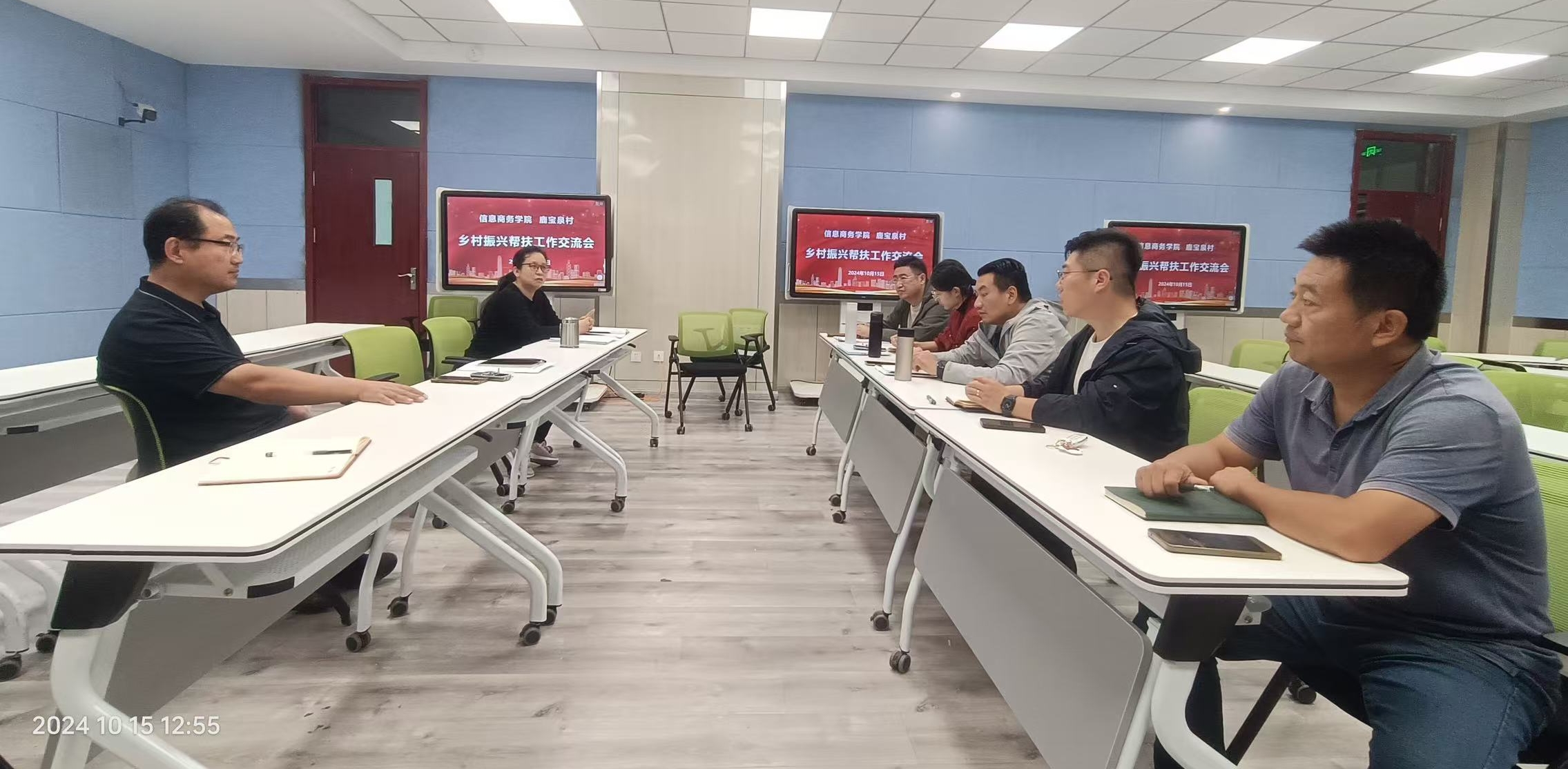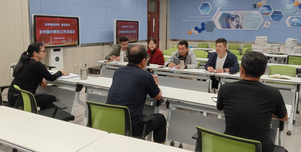 为进一步贯彻落实省、市乡村振兴工作相关会议精神,推动高校人才及技术资源向基层下沉,充分发挥我校教育和科研资源优势,推动校派第一书记驻村帮扶工作,10月15日,信息商务学院组织召开“乡村振兴帮扶工作交流会”。信息商务学院党总支书记朱英华、院长赵红艳、副院长宋济明、许涛、市场营销教研室主任王桂东、数字媒体教研室主任杨公博、电子商务教研室负责人马丽及校派鹿宝泉村第一书记刘洋参加会议。