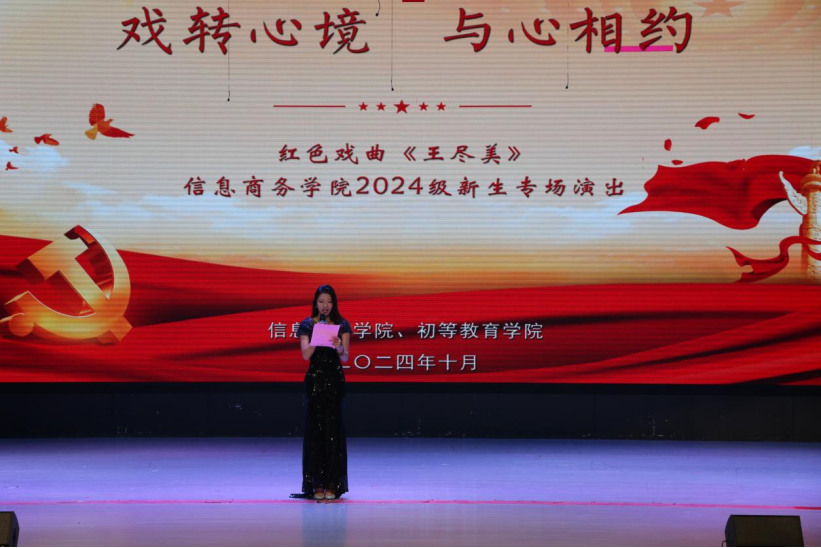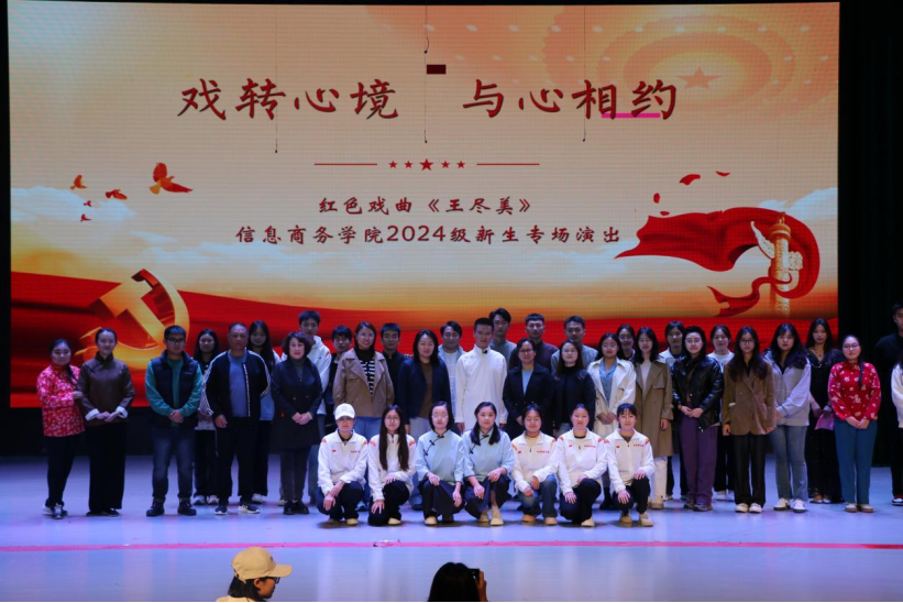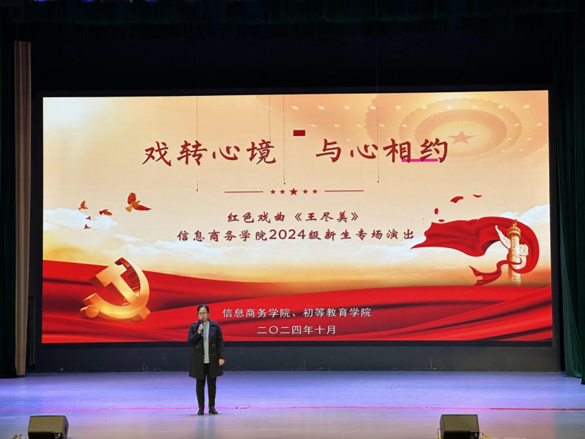 为进一步提高信息商务学院新生心理健康水平,帮助新生更好的适应大学学习和生活,10月21日,信息商务学院开展“戏转心境,与心相约”红色戏曲观赏活动,特邀初等教育学院鲁韵戏曲社为新生展演《王尽美》红色戏曲,信息商务学院院长赵红艳、党总支副书记王晓辉、学院学工办主任成立娟、重庆幼高专来院交流教师赵蕾、初等教育学院学工办主任董倩、学生工作处教师王晶、心理健康教育中心教师王棣悦、吴大勇、狄学芹、信息商务学院全体辅导员以及2024级新生代表观看了此次展演。