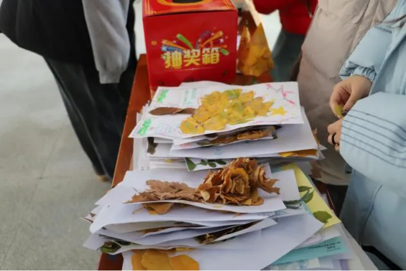 活动第二环节——盲盒集市于11月27日下午在实验楼一楼大厅举办,树叶和废旧物品制作出的树叶徽章、落叶画、小挂件等手工艺品,在此刻被参与者们赋予了新的价值,每一份作品都蕴含着创作者饱满的热情,寄予不同的寓意,活动现场热闹非凡,参与者的笑容便是最好的证明,也是对美好生活的向往。