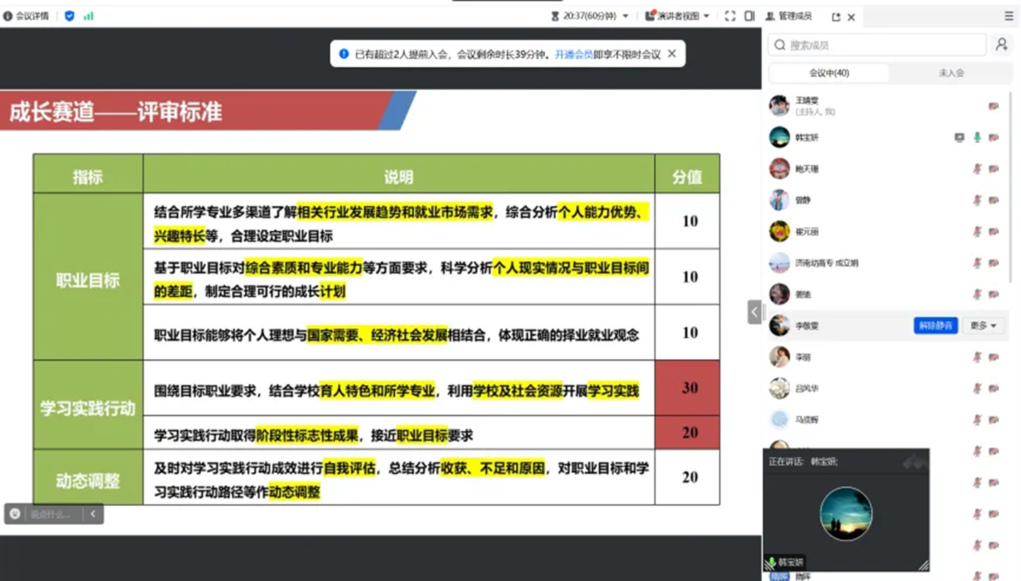 韩宝妍老师首先介绍了如何对职业规划大赛学生参赛作品进行评审,着重提醒老师们查看学生材料内容是否完整并做好不同的分类,讲述了职业目标、学习实践行动、动态调整等评分细则,为评委公正打分给出了实用的建议和指导。