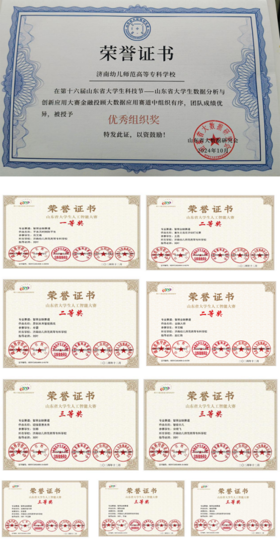 2024年第十六届山东省大学生科技节暨第七届山东省大学生人工智能大赛“智慧金融”赛项落下帷幕,来自全国各省、区、市高职院校的900 余名学生展开激烈争夺,我院学子脱颖而出,喜得佳绩,同时,我校获得优秀组织奖。