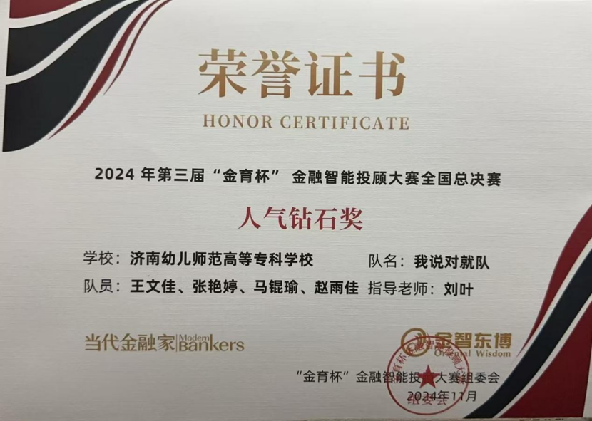 2024年第三届金育杯金融智能投顾竞赛全国总决赛中,我院金融科技应用专业张艳婷、马锟瑜、赵雨佳和王文佳4人团队,凭借专业技能与团队协作,获人气钻石奖。本次大赛自2024 年9 月启动以来,共吸引了来自全国20 多个省份地区5000 余名在校大学生的积极参与。在经历了备赛与培训、校级选拔赛、部分省级选拔赛等层层角逐后,最终全国选拔出200余支队伍晋级到决赛阶段。