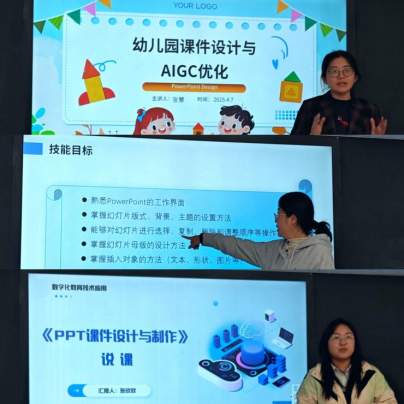 在数字化教育技术应用课程组的说课环节,三位老师聚焦于PowerPoint设计制作进行说课,均以AIGC生成PPT引入,从不同角度和方面展开,充分展示了数字技术在教学中的创新应用。他们分别从设计理念、教学目标、内容组织、教学方法等方面进行了详细阐述,突出了数字技术在提升教学效果和学生学习体验中的重要作用。