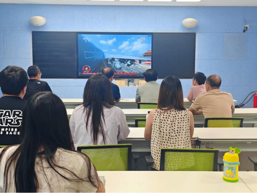 实验楼214会议室内,教师们神情肃穆、全神贯注,认真聆听大会精神,内心涌动着对历史的深切缅怀和对和平的由衷珍视。这场意义非凡的直播,为全体人员上了一堂深刻而生动的爱国主义教育和国防教育课。
