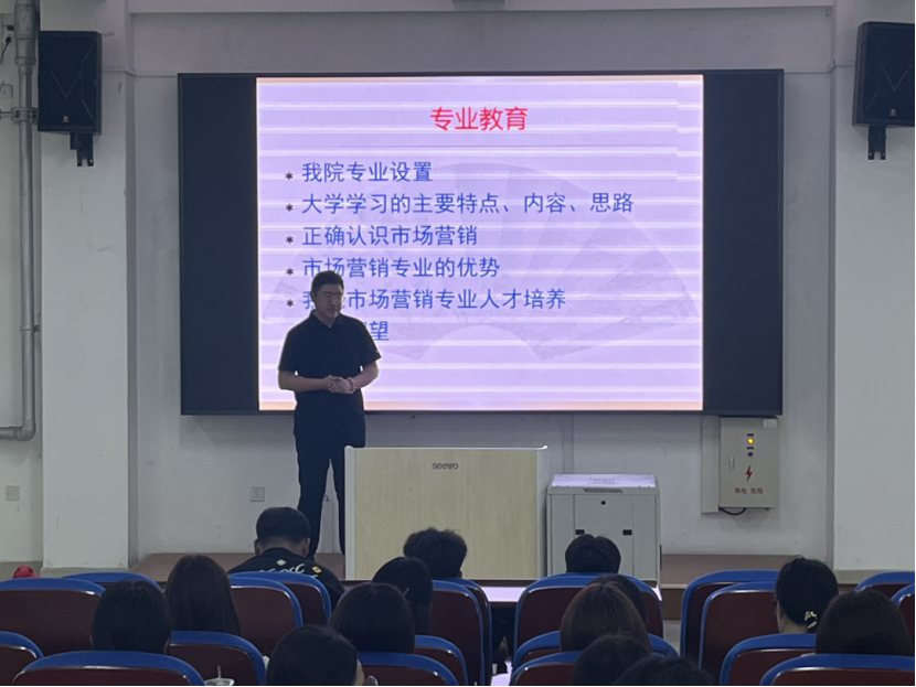 市场营销专业负责人王桂东老师从核心概念入手,结合案例让新生初步认识专业。他还介绍了该专业在快消、互联网等多行业的就业方向,指出就业面广、岗位需求稳定的特点。同时,分析了数字化、智能化背景下专业的新变化与新机遇,鼓励新生关注行业动态,做好规划。