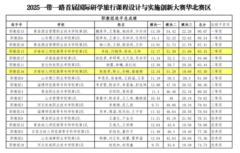 2025年9月28日,2025一带一路暨金砖国家技能发展与技术创新大赛首届国际研学旅行课程设计与实施创新赛项华北赛区比赛圆满落幕。信息商务学院2023级研学旅行管理与服务专业两支参赛队伍,在学院领导的关心与专业教师的精心指导下,经过数月刻苦备战与赛场上的稳定发挥,最终从华北赛区激烈竞争中脱颖而出。其中,由赵红艳院长与曾静老师共同指导的参赛组荣获二等奖,并成功晋级全国总决赛;由张清、厐瑛老师指导的参赛组荣获三等奖。