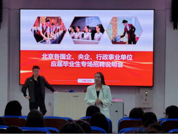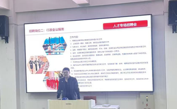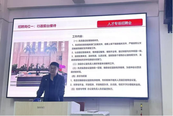 随后,中京旅服控股集团有限公司韩超经理登台宣讲。他首先系统介绍了公司的发展历程、企业文化和多元业务板块,随后重点讲解了为实习生定制的岗位职责、系统的培训体系以及清晰的职业发展通道。结合行业趋势,韩经理深入剖析了研学旅行领域的广阔前景与巨大人才缺口,并勉励同学们:“这个充满活力的朝阳产业,正迫切需要各位专业人才的加入。中京旅服愿成为大家事业的起跑线,期待你们在这里锻炼能力、实现价值,与我们共同定义研学的未来!”