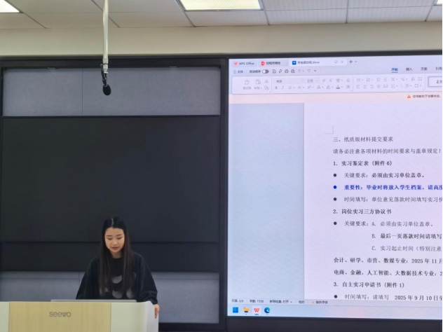 为进一步做好2023级毕业生实习工作,明确工作目标和工作安排,2025年10月16日中午,信息商务学院在西部片区3113会议室召开2023级毕业实习工作部署会。本次会议由教务员周欣妍老师主持,副院长宋济明、副院长许涛、各专业负责人及全体毕业生实习指导老师参会。