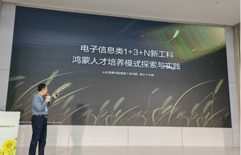 山东管理学院智能工程学院院长于治国分享了鸿蒙方向课程建设与赛教融合经验,提出“从培养方案切入,将信创技术融入课程体系”。