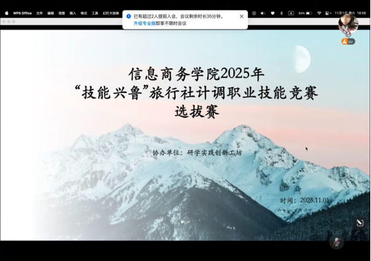 本次选拔赛以设计旅游产品方案为主线,设置了文化传承、齐鲁非遗、红色精神等多个主题方向。参赛学生需独立完成一份完整的旅游产品设计方案,并制作答辩PPT进行讲解。在11月1日晚举行的线上答辩环节中,同学们围绕产品创意、资源整合、市场可行性等方面进行了精彩阐述。研学旅行管理与服务教研室主任曾静老师全程指导赛事组织,教研室老师担任评委并进行专业点评。信息商务学院副院长宋济明、许涛莅临指导,对学生的创新思维与专业素养给予高度评价,并在总结发言中鼓励同学们以赛促练、以练促优,不断提升综合能力。