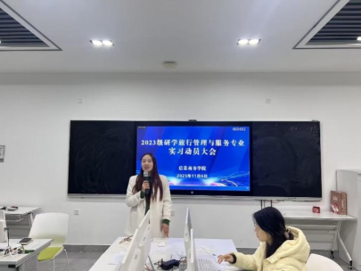 为扎实推进学生实习工作,引导学生做好实习前的各项准备,2025年11月6日,信息商务学院在实训楼1419为2023级研学旅行管理与服务专业学生举行了实习动员大会。会议由研学旅行管理与服务专业教研室主任曾静主持,2023级研学旅行管理与服务专业全体学生参会。