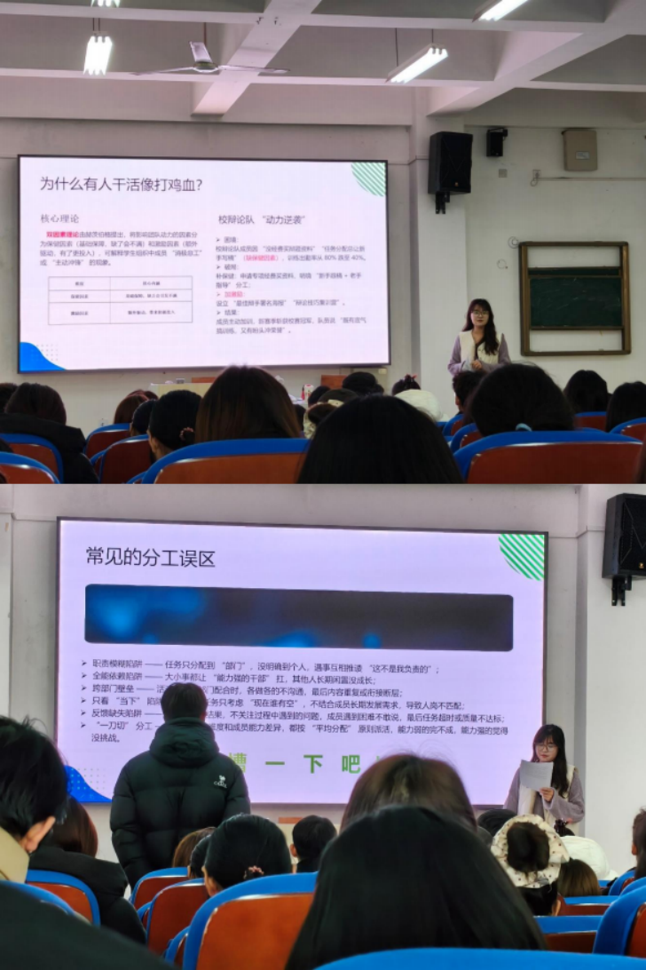 培训伊始,苏欣老师围绕“团队协作的底层逻辑”“从骨干到核心的蜕变”“从理论到落地的闯关”三大板块系统展开讲解。在剖析团队协作底层逻辑时,她首先列举了职责模糊、全能依赖、跨部门壁垒等常见分工误区,进而引发在场学生干部对工作中协作问题的深度思考。为了让理论更易落地,苏欣老师既结合“为什么有人干活像打鸡血”的情景设定,引入双因素理论,探讨如何破解部门积极性低迷的困境;又借“为什么有人是团队‘死忠粉’”的话题,深入讲解社会认同理论,同时通过分享电商2班带货天团团建的成功案例,着重提醒大家规避虚假认同陷阱、群体极化风险等理论应用中的雷区。
