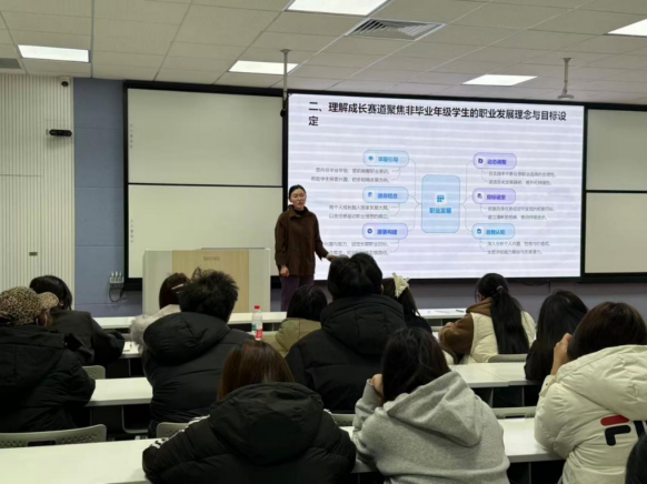 讲座伊始,王婧雯老师以“助力职业梦想,规划精彩未来”为主题切入,强调了职业规划对于大学生个人发展的重要意义。她指出,职业规划大赛不仅是一场比赛,更是一个系统审视自我、探索外部世界、明确发展方向、锻炼综合能力的宝贵过程。积极参与备赛,其价值远超越奖项本身,是每一位同学为未来职业发展打下坚实基础的“必修课”。