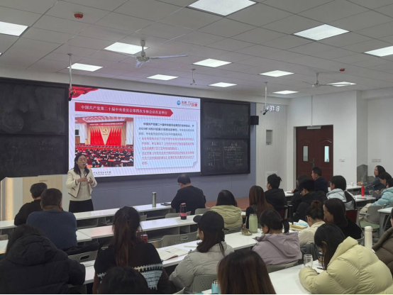 报告会上,赵翠萍教授以系统全面的解读、鲜活生动的阐释,为师生带来深刻的理论滋养,首先回顾了“十四五”时期我国在经济实力、科技实力、综合国力等方面取得的历史性成就,明确了“十五五”时期作为基本实现社会主义现代化夯实基础、全面发力关键时期的重要定位。随后,围绕“十五五”规划的历史方位、总体部署、重大任务三大核心维度,深入解读了全会提出的“坚持高质量发展、加快高水平科技自立自强、建设现代化产业体系”等关键部署,既立足国家战略全局,又结合教育领域发展实际,让师生清晰把握未来五年发展的发展方向与落实举措。