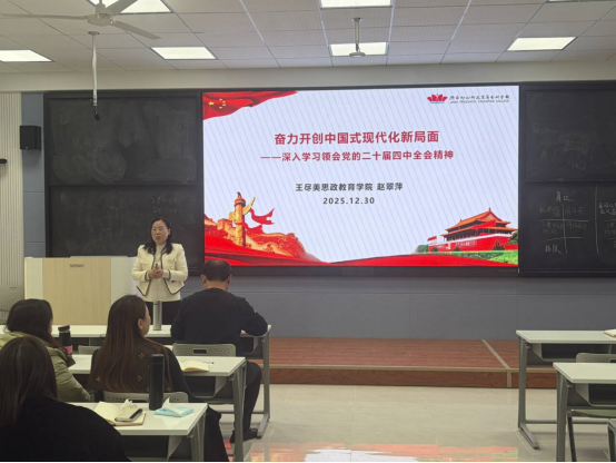 2025年12月30日,信息商务学院组织全体教职工及部分学生代表,在俊千楼3113教室召开学习贯彻党的二十届四中全会精神专题会议。会议特邀王尽美思政教育学院赵翠萍教授,带领师生深入学习全会审议通过的《中共中央关于制定国民经济和社会发展第十五个五年规划的建议》,推动全会精神在学院落地生根。