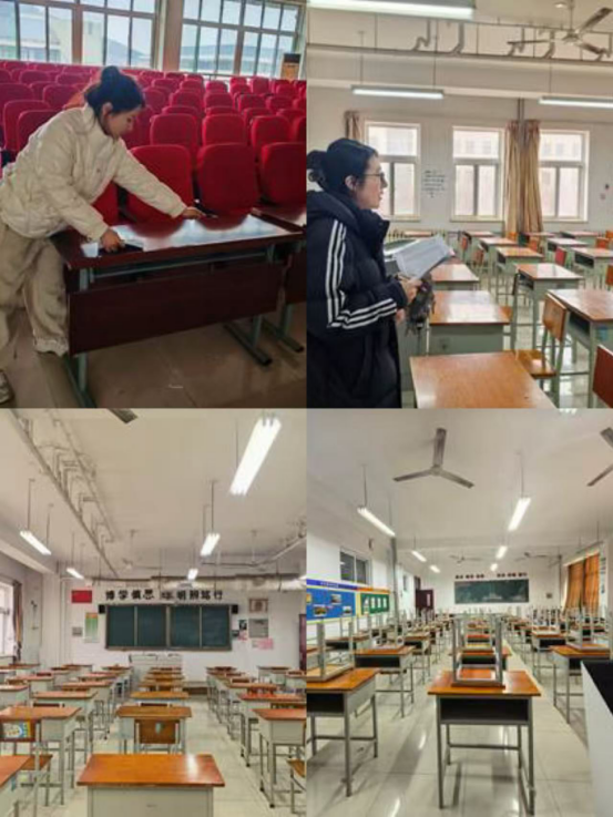 检查工作严格对标学院要求。在考场方面,重点核查了桌椅摆放是否整齐统一、室内卫生是否整洁达标、以及清洁工具与遗留物品是否规范收纳。对于发现的问题,检查人员现场记录并反馈,督促相关班级立即整改,确保所有考场在考前达到规定标准。