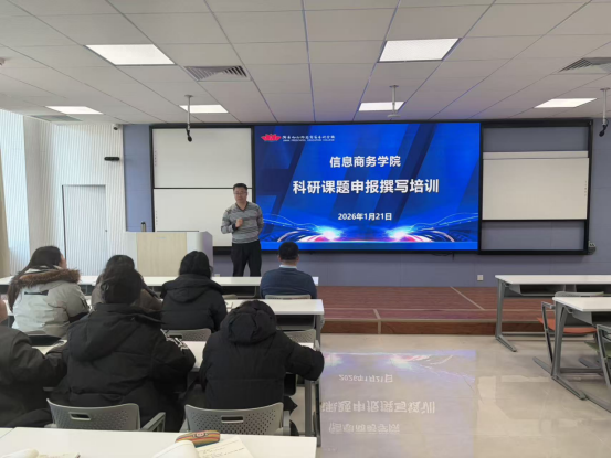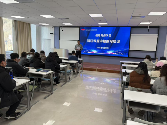 为有效提升学院教师的科研课题项目申报水平,进一步推动学院科研工作高质量发展,2026年1月21日上午,信息商务学院在俊千楼2110会议室成功举办了“科研课题申报与撰写”专题培训会。会议邀请宗峰副教授担任主讲,由学院副院长宋济明主持。
