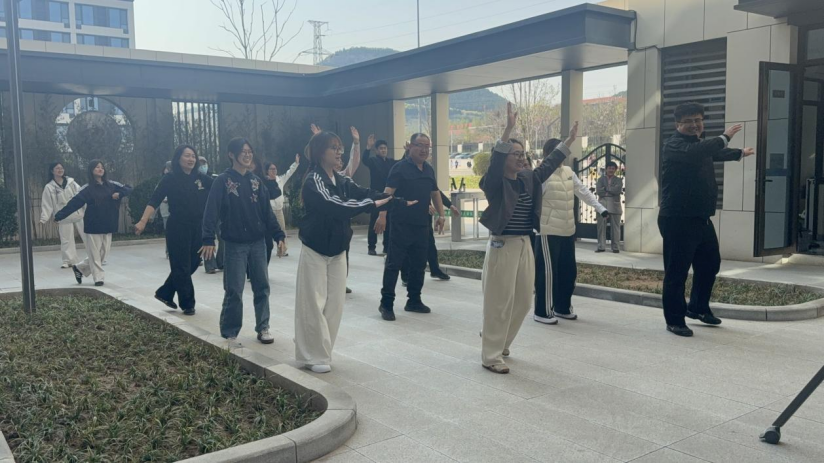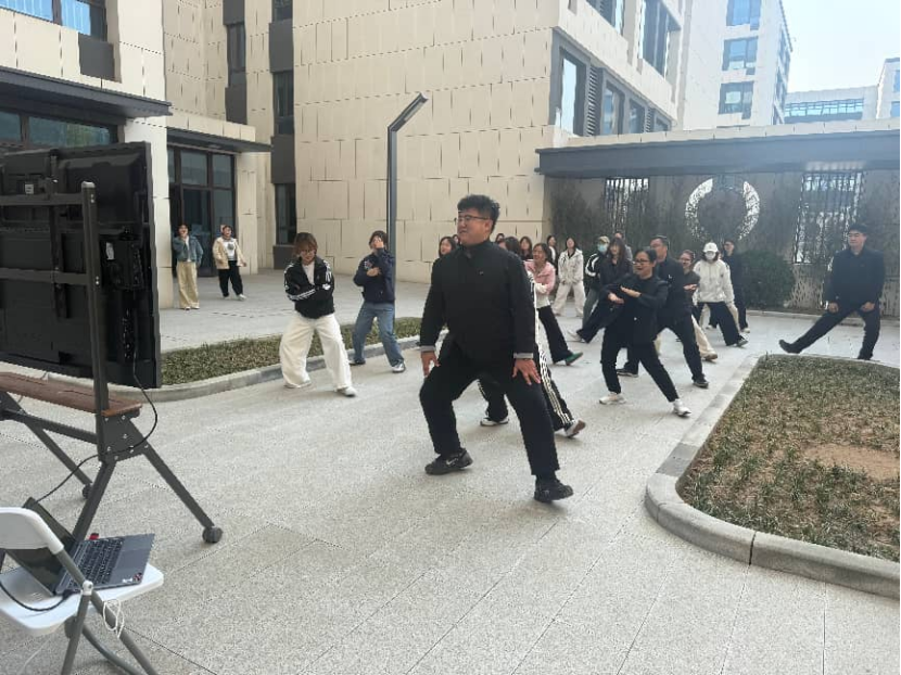信息商务学院党总支书记朱英华、院长赵红艳、党总支副书记王晓辉、副院长宋济明及各位辅导员老师们亲临现场,与同学们共同开启养生打卡之旅,大家精神饱满、动作协调,在动静结合的练习中舒缓久坐疲劳、涵养身心元气。