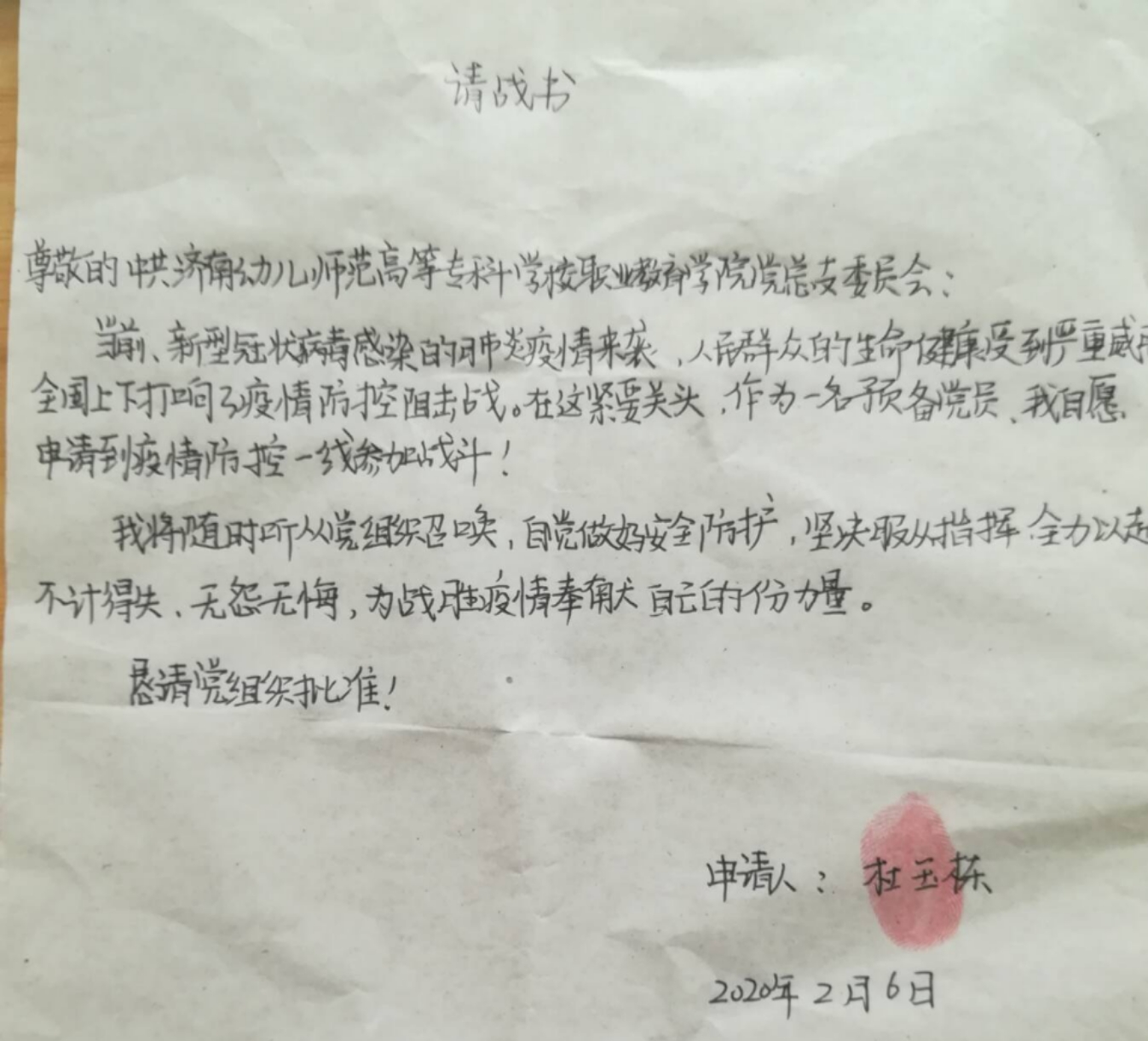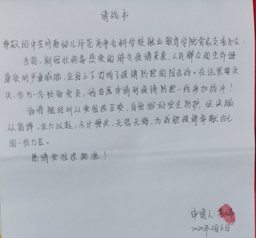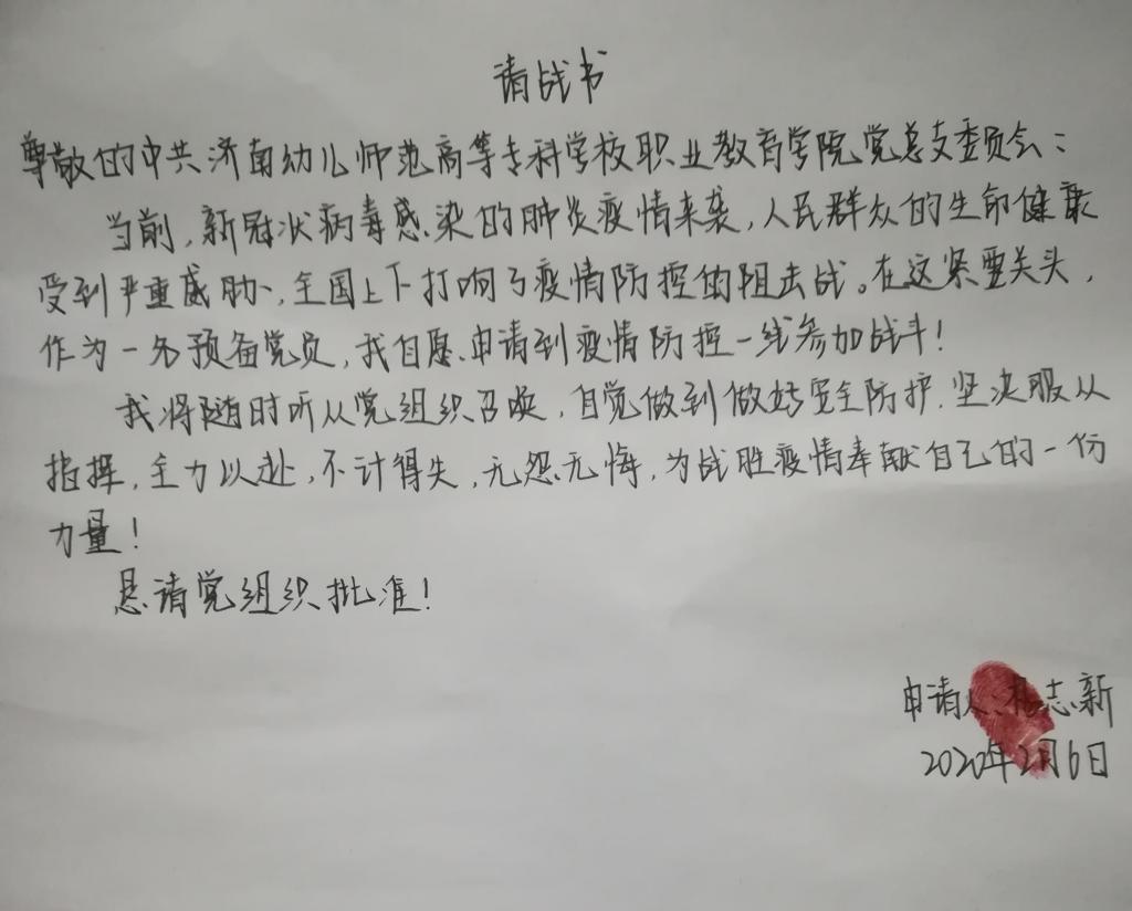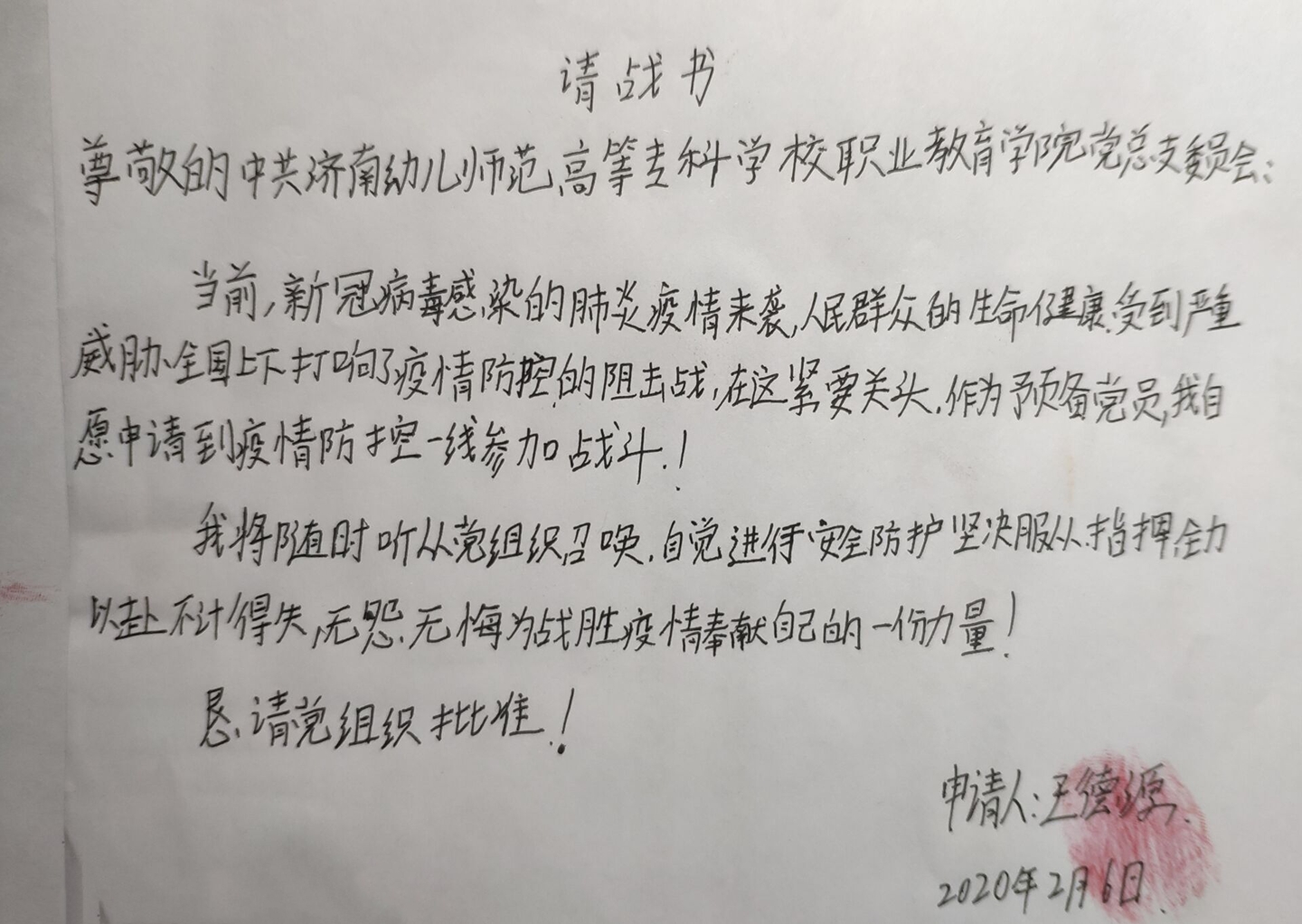 2月5日,17级数媒1班的房洪鑫带领杜玉栋、杨志新等14名学生预备党员向职业学院党总支提交了“请战书”。