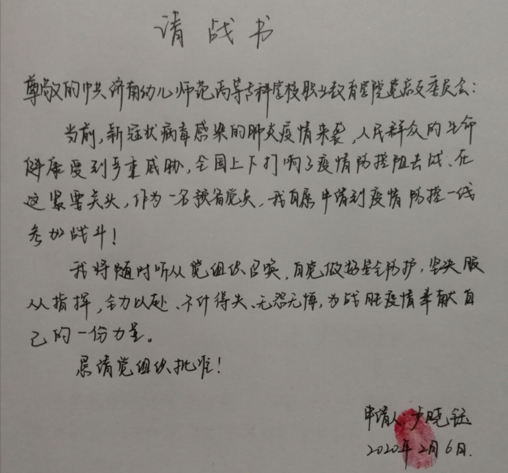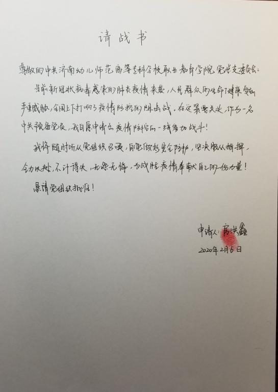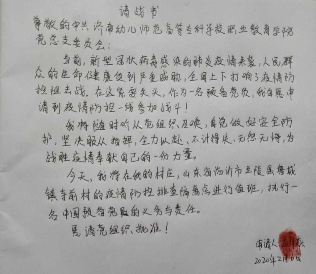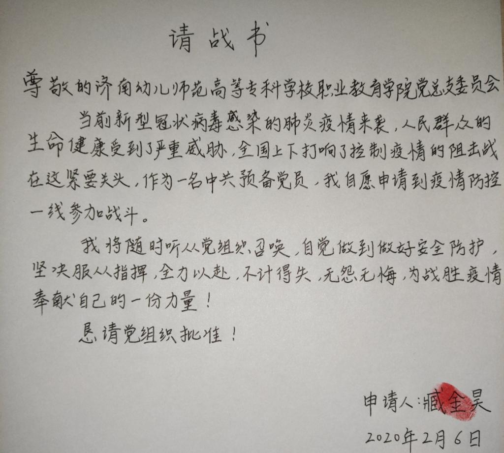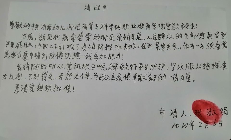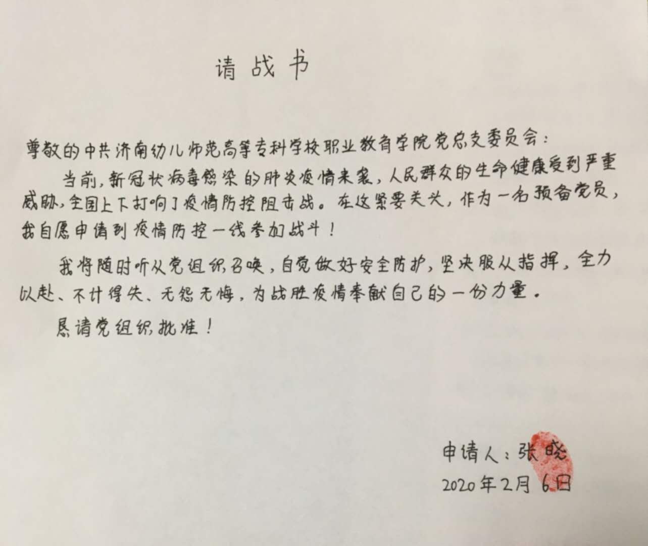 2月5日,17级数媒1班的房洪鑫带领杜玉栋、杨志新等14名学生预备党员向职业学院党总支提交了“请战书”。