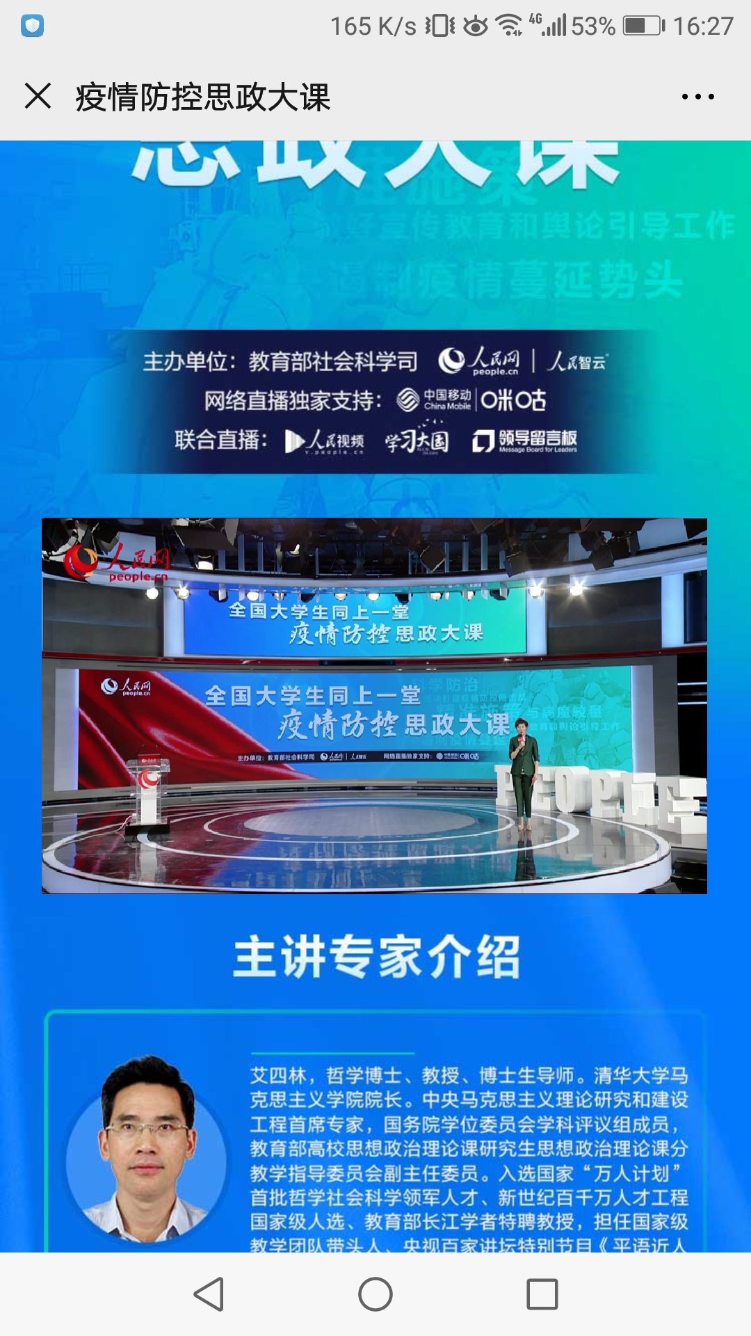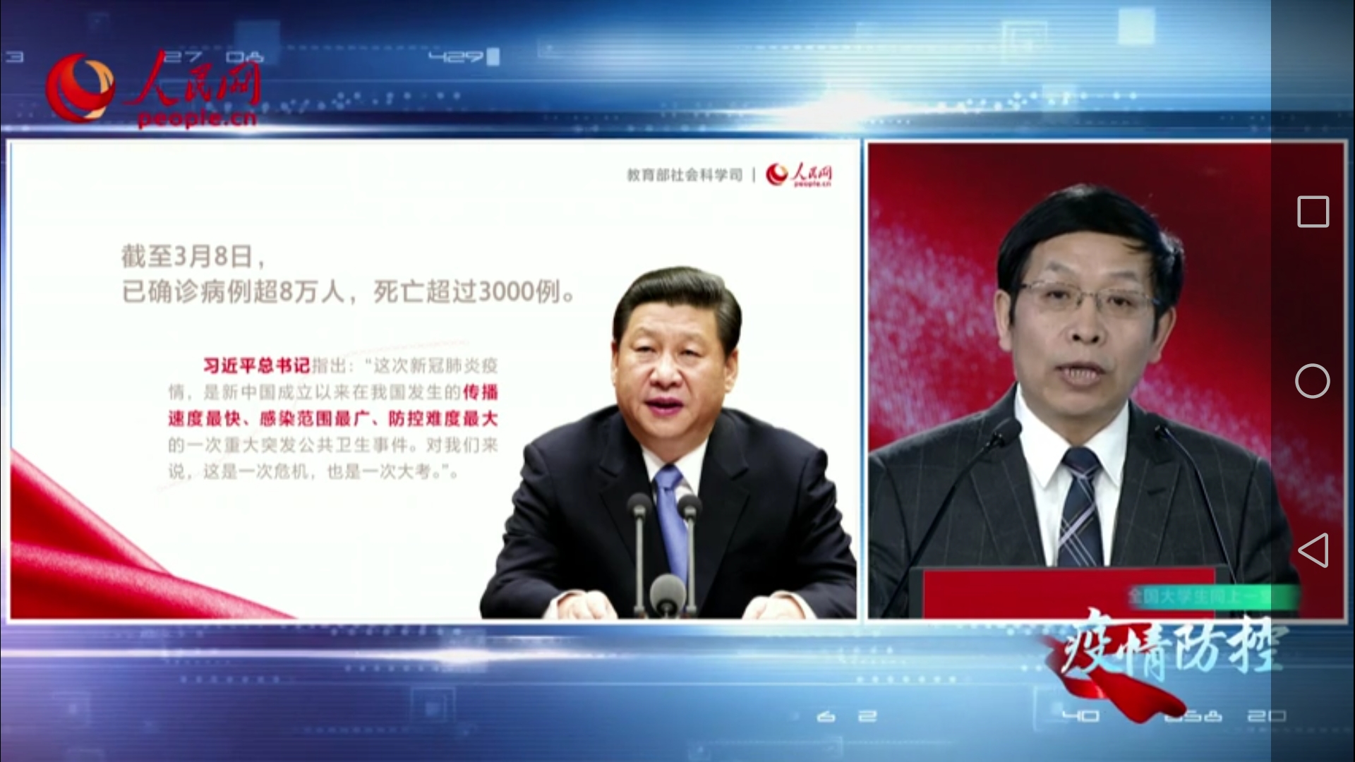 我院36名教师,807名学生通过手机和电脑的方式观看直播课,课程分别由艾四林、秦宣、王炳林、冯秀军四位教授,结合“马克思主义基本原理概论”“毛泽东思想和中国特色社会主义理论体系概论”“中国近现代史纲要”“思想道德修养与法律基础”四门必修课教学内容,解读了党中央关于疫情防控的决策部署,分析了中国抗疫彰显的中国共产党领导和中国特色社会主义制度的显著优势,讲述了防疫抗疫一线的感人故事,引导当代青年正确认识疫情,培养勇于奉献,敢于担当的精神。
