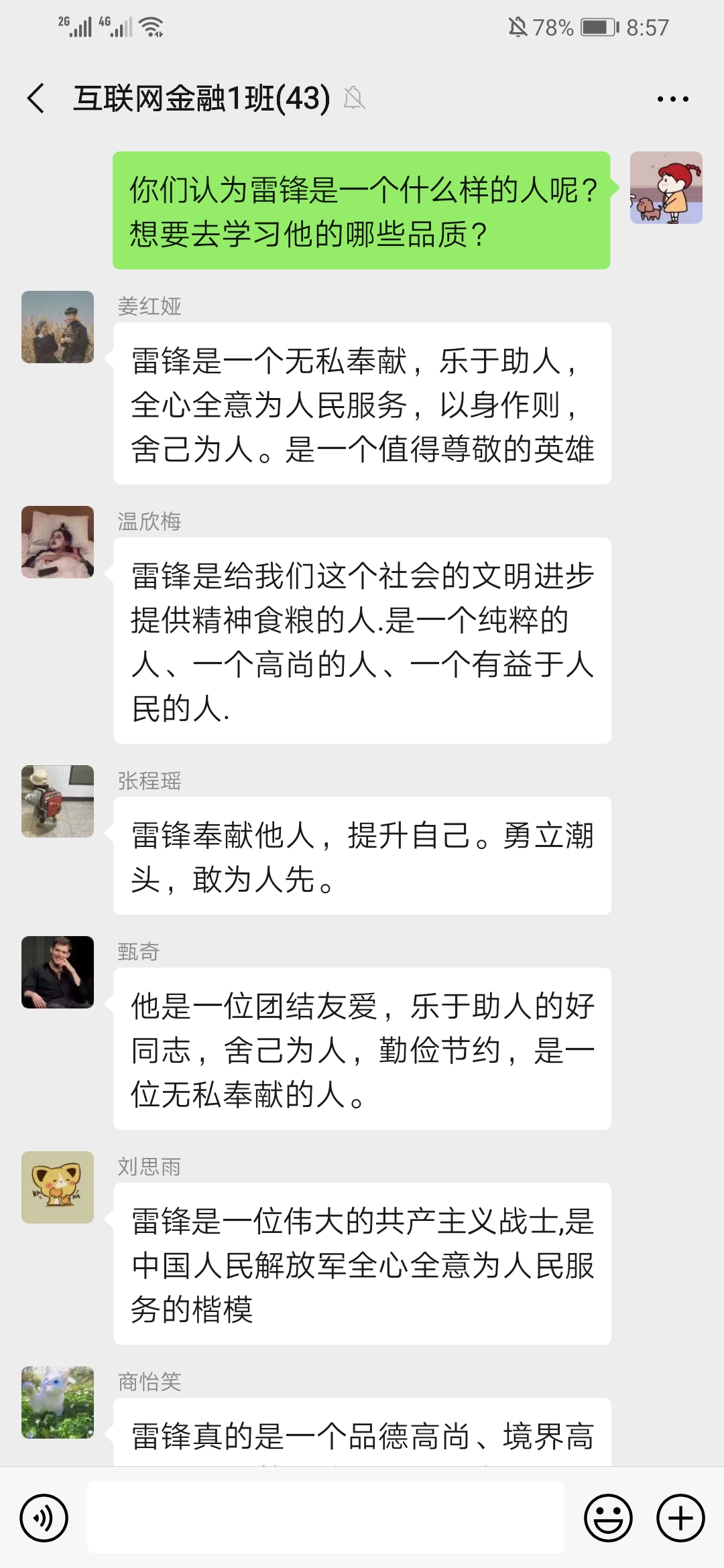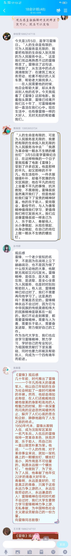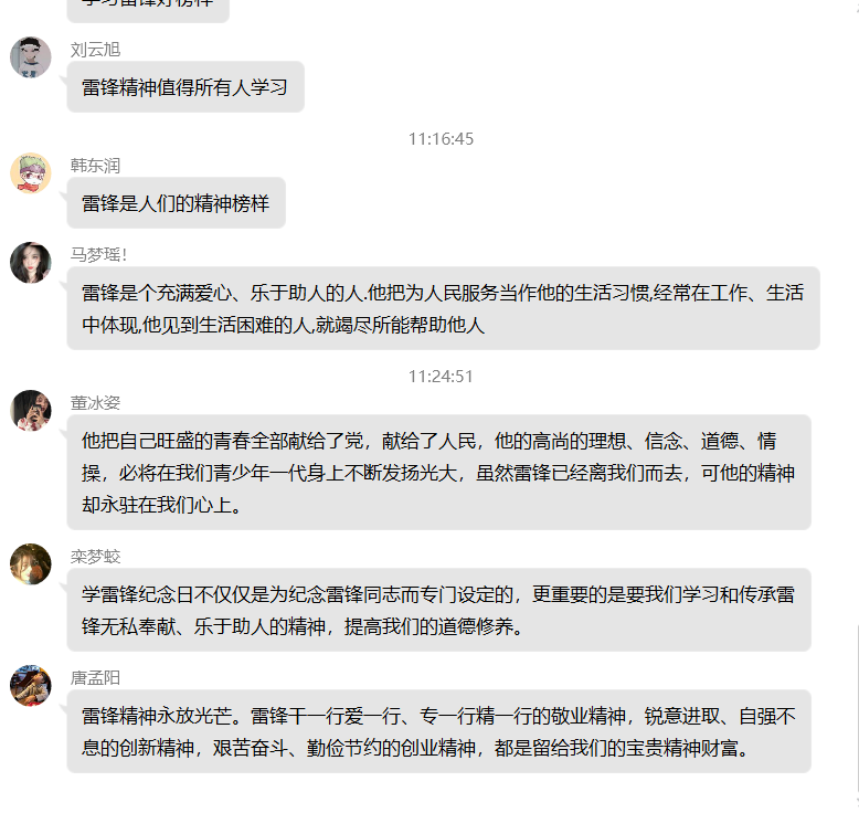 各个班级结合本班实际情况制定了主题团日活动方案,依托班级群、微信群等媒介平台,通过观看雷锋电影、写给雷锋叔叔的一封信、制作海报、手绘雷锋日记、学习雷锋故事线上交流会、撰写观后感、参观网上抚顺雷锋纪念馆等多种方式开展了主题团日活动,全面领会雷锋精神的本质内涵和时代要求,将雷锋精神内化于心,外化于行。